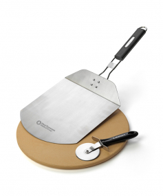This 3 Piece set provides everything you need to grill a pizza - Pizza Stone, Pizza Peel and Pizza Cutter. Toss the stone on your grill and in about 15 minutes you'll be ready to turn professional looking grilled pizzas out at home. Set includes 13" Pizza Stone; Folding Pizza Peel and Pizza Cutter Folding handle stainless pizza peel stores easily. Complies with CPSIA, Prop 65. 13" W x 2" H x 13" L