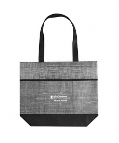Constructed of 70gsm Non-Woven Polypropylene. Features denim look. 5" bottom gusset, 3 front pockets, and 25-1/4" handles. Complies with Prop 65. 14" H x 16 3/4" W x 5 1/4" D